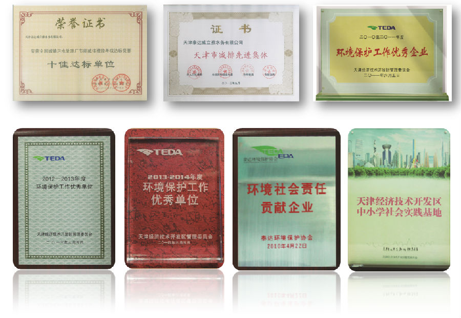 公司自成立以來,蒞年榮獲由中國城鎮供水排水協會、泰達環境保護協會、開發區管委會、泰達控股有限公司等機構頒發的各類先進榮譽共20余項,得到了天津市和開發區環保局、開發區管委會及合作股東的認可。